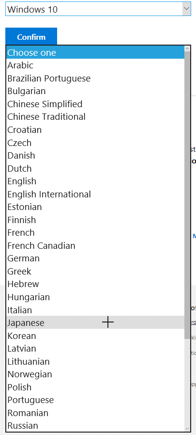 「Download Windows 10 Disc Image (ISO File)」のページに切り替わり、isoがダウンロード可能な状態になります。画像のように、「Windows 10」を選択して、「Confirm」をクリックしてください。